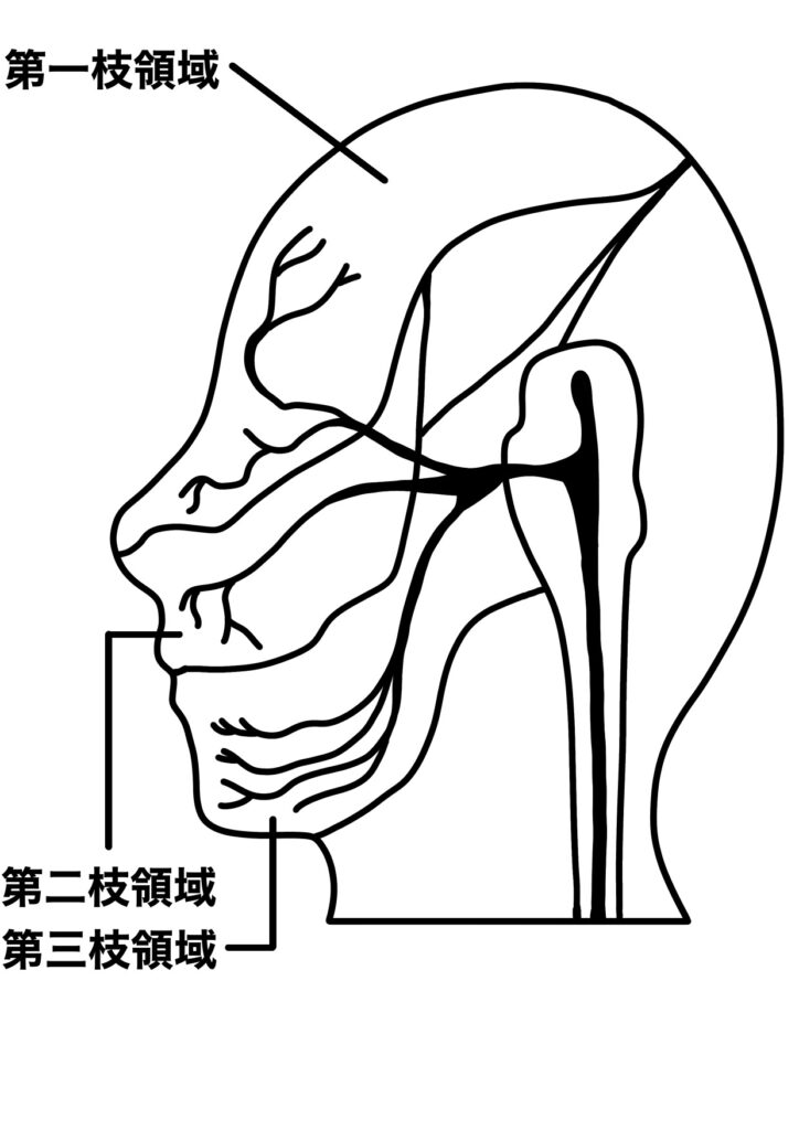 三叉神経の枝(眼神経「第一枝領域」、上顎V2「第二枝領域」、下顎V3「第三枝領域」)のいずれか単独または混合で痛みが現れる(最も多いのはV2・V3)