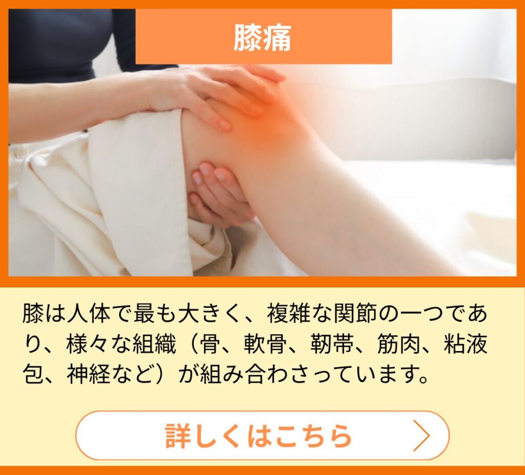 • 関節可動域制限:曲げ伸ばしが制限される、正座や深く曲げる動作が困難
