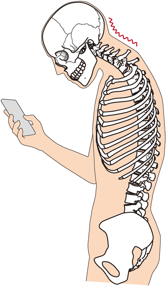 近年はスマートフォンやパソコンの使用時間増加によって「ストレートネック」や「巻き肩」とセットで現れることが多く、現代人に非常に多い姿勢異常のひとつです。