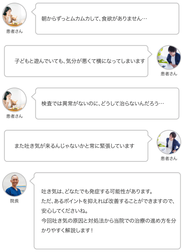 等の自律神経の症状をお持ちです。当てはまる方は、自律神経の症状が原因で吐き気が出ている可能性が高いです。