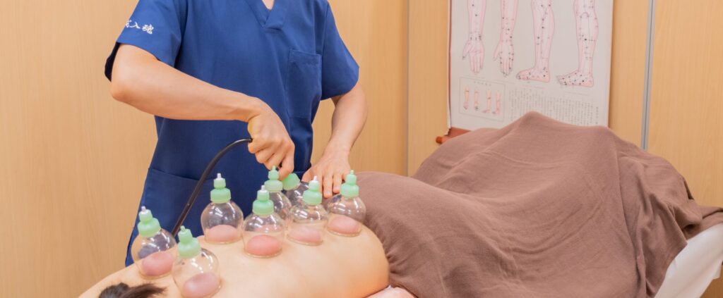 吸角施術(カッピング)は、痛みのある場所にプラスティックのカップを吸い付けて、筋肉内に溜まった疲労物質を吸い上げることで、血行の循環がめざましく活発化して、筋肉のこりを早期に取り除くことが出来ます。